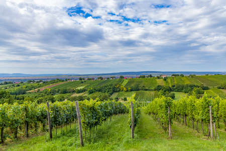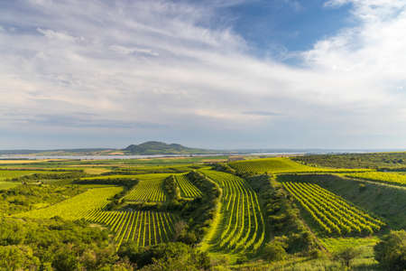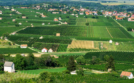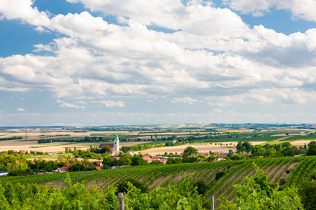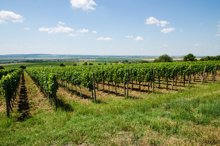 South Moravia, Czech republic: Vineyard fields on agriculture land. Countryside meadow, vineyard plant and beautiful landscape near small village. Summer and blue sky with nice clouds