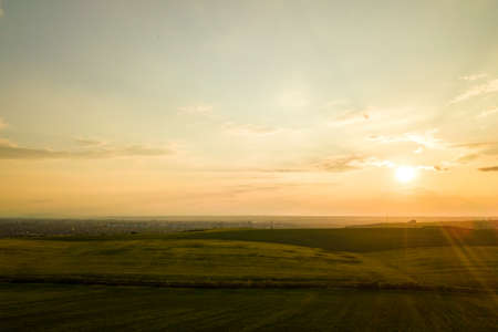 Aerial view of bright green agricultural farm field with growing rapeseed plants at sunset.