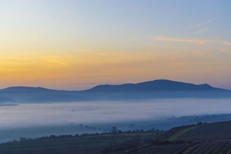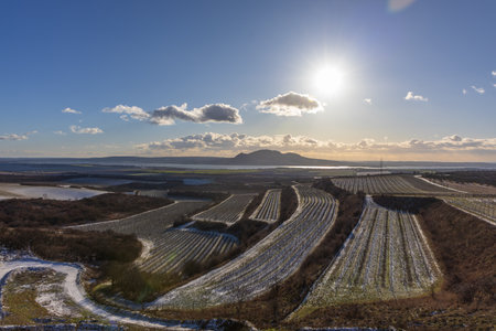 Winter landscape in South Moravia in the Czech Republic in Europe. Vineyards after winter in Palava.