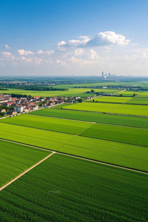 Aerial view of farmlands with road, green fields and meadows. Soil cultivation in spring