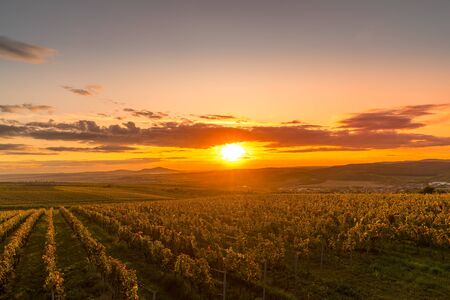 Field of grapevine vines view of grape lines from the side of an area of South Moravia before harvest at autumn sunset captured