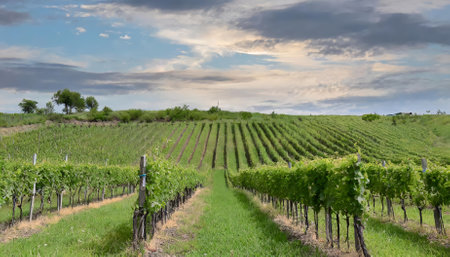 A stunning landscape of a vibrant vineyard with perfectly aligned rows of vines bearing ripe grapes. This idyllic setting is a testament to natures beauty and a vital step in producing