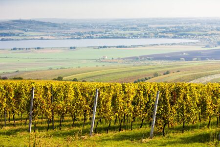 Vineyards near Nove Mlyny reservoir with Palava, Southern Moravia, Czech Republic