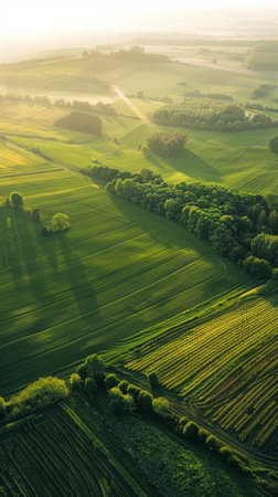 Golden sunrise illuminates rolling green fields with mist and a winding dirt road, creating a serene and atmospheric...