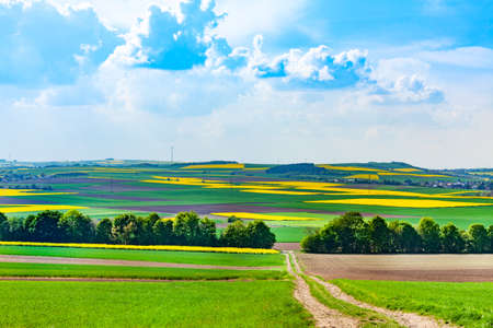 Rural road across agricultural field in Germany over hills during sunny summer day