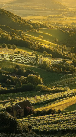 The golden hues of sunset illuminate the expansive vineyards nestled in the rolling hills, creating a tranquil countryside landscape. A quaint house is visible among the greenery.