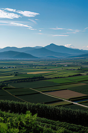 A view of the agricultural landscape of South Moravia around Mikulov and Pálava. Fields and vineyard under blue summer sky. Suitable for tourist advertising.