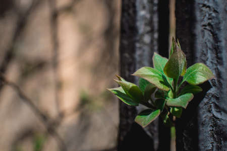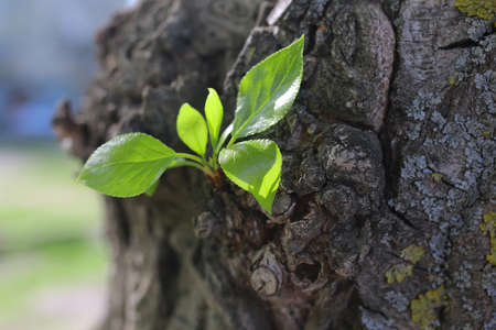 Closeup little plants bud leaves on tree trunk in the forest, green nature background