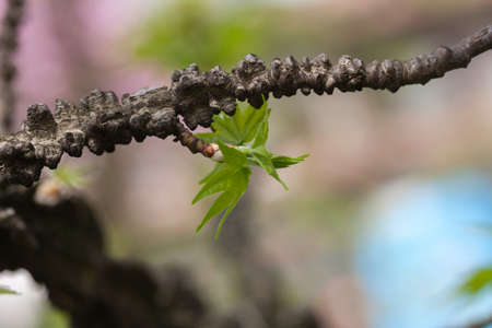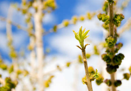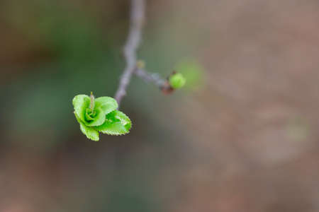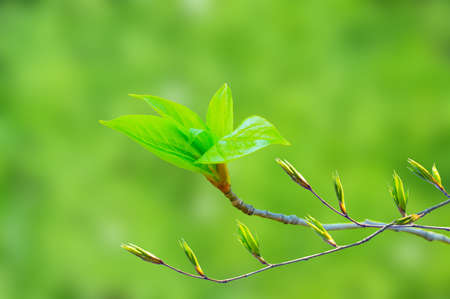 close up of tree branch with first leaves buds. Spring background with copy space.