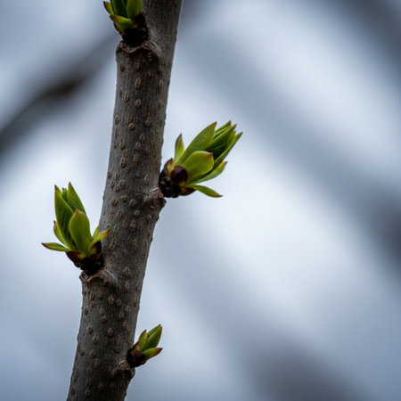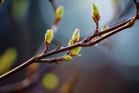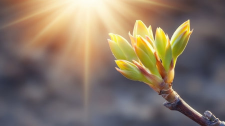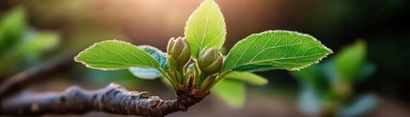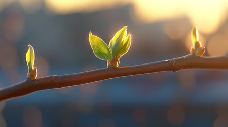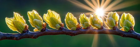 The gentle touch of spring sunlight bathes a tree branch, revealing the delicate emergence of new leaves from their protective buds A close-up view captures the tender unfolding, a vibrant symbol of rebirth and growth Nature's renewal unfolds in this breathtaking scene, a testament to the cyclical beauty of life AI Generative