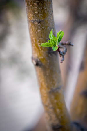 Budapest, Hungary - 25 January, 2020: the first small leaf bud newly formed on a thin branch of a bush at the beginning of spring