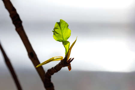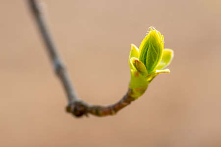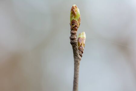 Close-up of a branch with buds and young green fresh leaves on a defocused background.