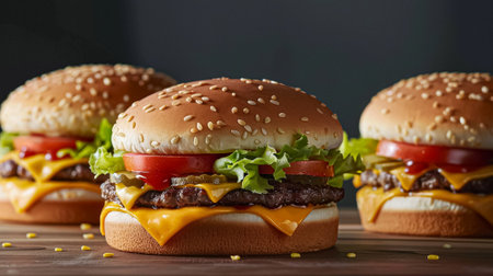 A collection of freshly made cheeseburgers sits on a tray, showcasing perfectly toasted sesame seed buns, layers of meat, vibrant lettuce, and melted cheese. The inviting arrangement enhances hunger in a casual dining atmosphere.