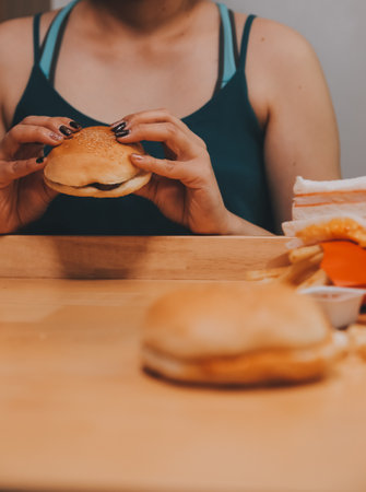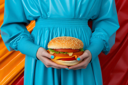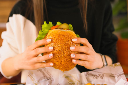 fast food, people and unhealthy eating concept - close up of woman hands holding hamburger or cheeseburger