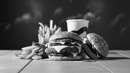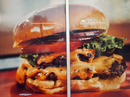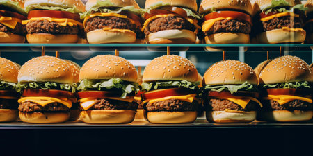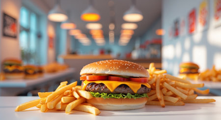 AI Generated. Delicious cheeseburgers and fries display in a fast food restaurant