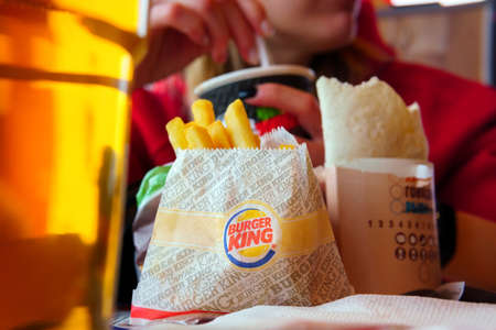 Tyumen, Russia-april 05, 2021: French fries at the Burger King fast food restaurant. selective focus