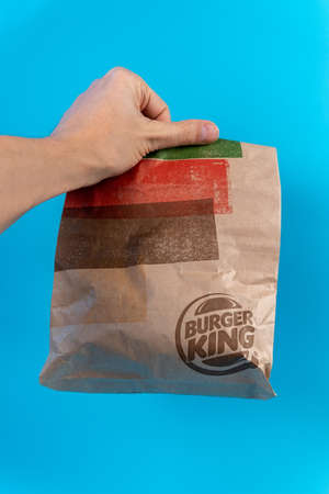 Tyumen, Russia-January 23, 2022: Burger King fast food restaurant . Blue Background