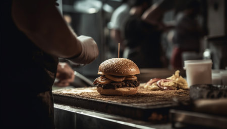 Grilled cheeseburger meal on table, ready to eat indoors generated by artificial intelligence