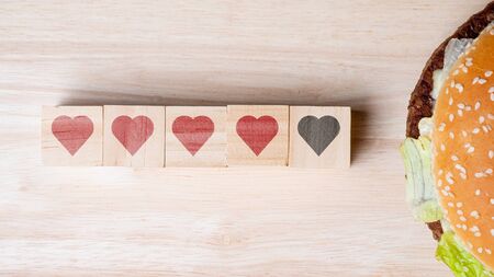 Burger with hearts icons on a wooden background. Rating concept. Close up.