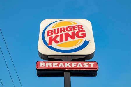 Augusta, Ga USA - 07 25 21: Burger King fast food restaurant exterior looking up street sign