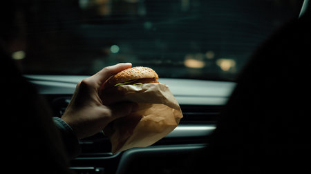 Hand grips a delicious burger in a rustic paper wrapper as night falls, ready for a tasty bite.