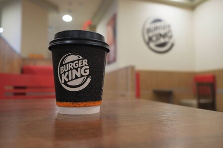 Astrakhan, Russia - April 15, 2019: Burger King Coffee-To-Go Takeaway Cup on Table at Blurred Restaurant Background With Logo On Wall. Burger King is Worldwide Fast Food Chain Selling Burgers, Fries, Desserts and Drinks.