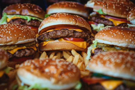 A row of hamburgers and fries are piled on top of each other. The hamburgers are topped with cheese and lettuce, and the fries are golden brown. Concept of abundance and indulgence