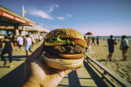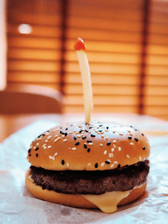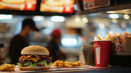 Juicy burger with fries in a busy fast-food restaurant during dinner rush