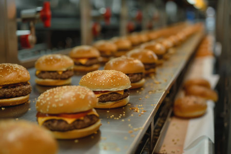 AI burger production line showcasing new taste technology, futuristic food processing.