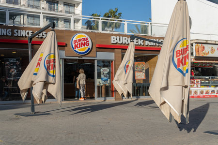 Palma Beach, Spain; April 23 2022: General view of the facade of the multinational fast food company, Burguer King, located in the tourist resort of Playa de Palma. Island of Majorca, Spain