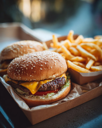 Two delicious cheeseburgers and golden French fries presented in a paper tray, creating a tempting fast food indulgence