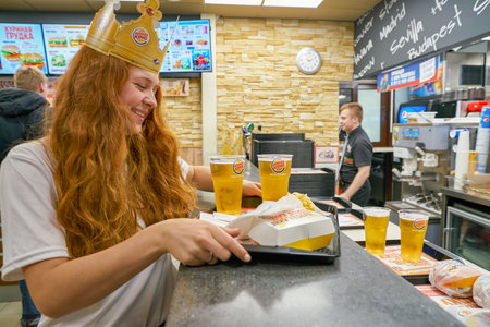 SAINT PETERSBURG - CIRCA OCTOBER, 2017: woman with a cardboard crown at Burger King restaurant. Burger King is an American global chain of hamburger fast food restaurants.
