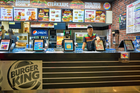 MOSCOW, RUSSIA - CIRCA NOVEMBER, 2019: counter service at Burger King restaurant in Domodedovo International Airport.