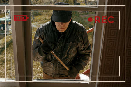 Security camera.Thief in uniform black jacket various action housebreak. The Robber terrorism criminal escapes with balaclava and crowbar entering a house for stealing Housebreak at night
