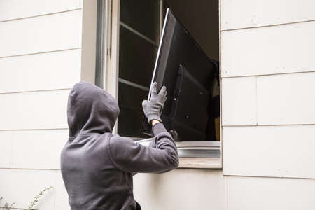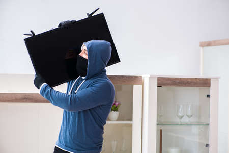Thief with black mask stealing modern expensive television. Masked face. Man burglar stealing tv set from house