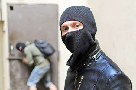 A cautious man in a black mask and blue hoodie enters someone else's house to rob the owners, breaking apartment, stealing someone else's property.