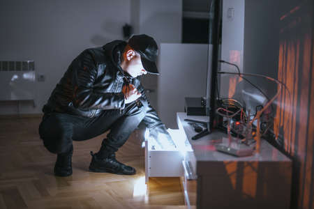 High Angle View Of A Robber Searching In Vacant House For Valuables
