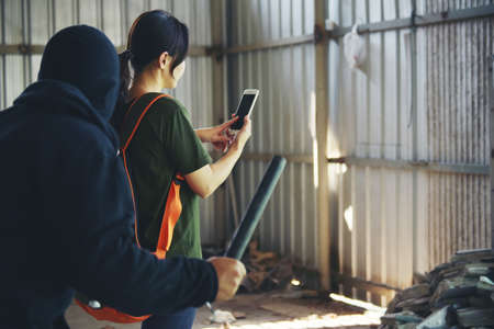 Thief armed man rob woman by baton on street stalker behind young woman back. Woman on phone careless stalker sneaking to steal, rob aggressive by danger bandit. Thief using baton nightstick weapon.