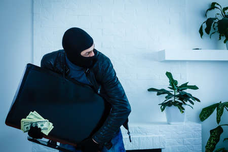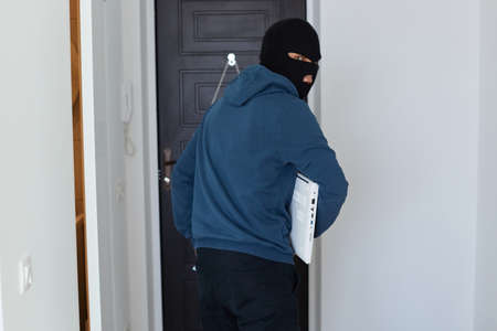 Man robber wearing blue hoodie and black balaclava posing near the door of the house he robbed, holding a laptop and money, looking back, afraid to be seen.