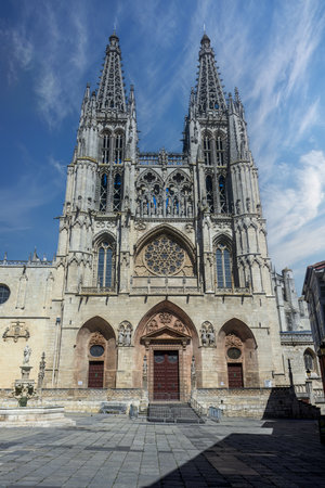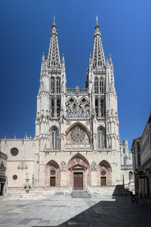 Main facade of the Gothic Cathedral of Burgos on a sunny day. Burgos, Castilla y León, Spain