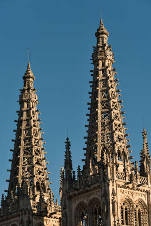 Spain, Burgos, upward view of the bell towers of the Cathedral of Saint Mary