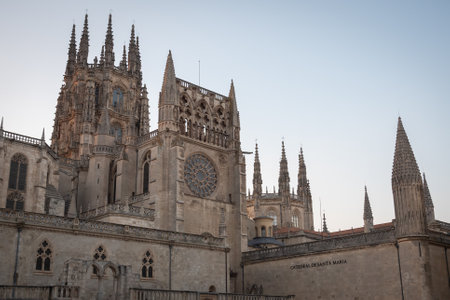 Burgos (Castilla y Leon, Spain): exterior of the medieval cathedral, in gothic style, at evening