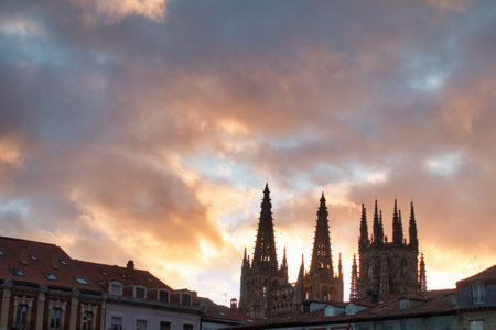 Cathedral Spiers at Sunset in Burgos, Spain - Dramatic, colorful sky over the Gothic architecture of Burgos Cathedral and old town rooftops at dusk.