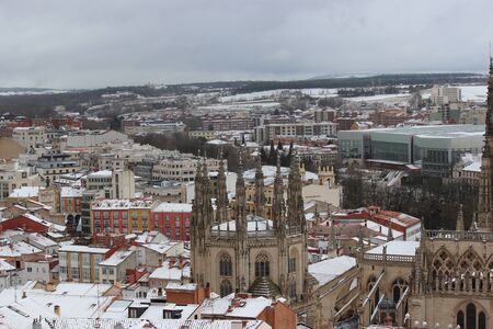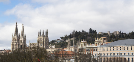 high view panorama cityscape of Burgos city, with famous gothic catholic cathedral St Mary or Santa Maria, monument from XIII Century, in Castile and Lion, Spain Europe
