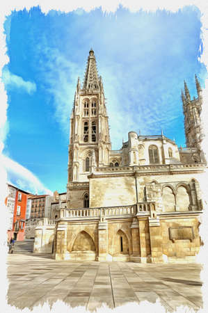 Picture from a photo. Oil paint. Imitation. Illustration. Cathedral in the city of Burgos was founded in 1221. The main Catholic church of Castile