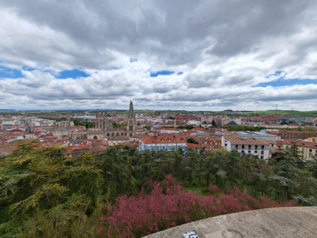 Wide panoramic view of Burgos with cathedral spiers and surrounding buildings