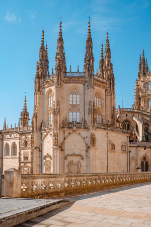 the gothic towers and ornate stonework of the cathedral of Burgos rise against a clear blue sky, seen from Fernan Gonzalez street on a bright summer morning in northern Spain