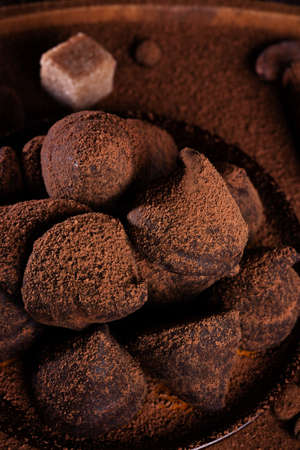 Chocolate truffles. Dark chocolate candies with cocoa on a dark background