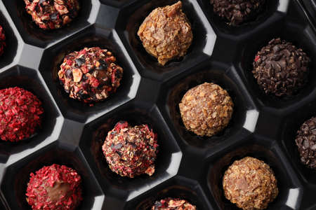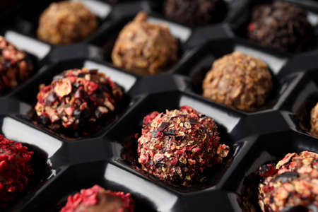 Premium gourmet chocolate handmade truffles from confectionery, homemade dark chocolate candies on black background