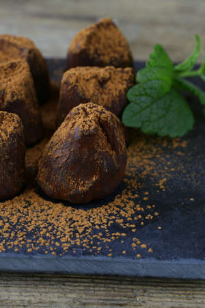chocolate candy truffle with cocoa and mint
